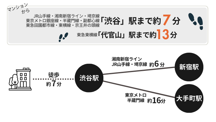 JR山手線・湘南新宿ライン・埼京線、東京メトロ半蔵門線・銀座線・副都心線、京王井の頭線、東急東横線・田園都市線「渋谷」駅から徒歩約7分に位置する物件です。