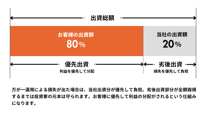 優先劣後⽅式により、投資家の皆様へは優先出資分としてファンド組み⼊れ総額の80%(3,840万円)を募集します。⼀⽅、当社はファンド全体の調達額の20%(960万円)を劣後出資いたします。