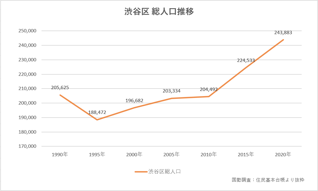 渋谷区の人口は1995年を底に、その後緩やかに回復しています。要因としては、渋谷駅周辺を中心としたオフィスや住宅の整備による街の魅力向上が挙げられ、働く世代の転入が顕著になったことが背景にあります。今後も再開発や都心回帰の影響で、さらなる人口増加が見込まれています。