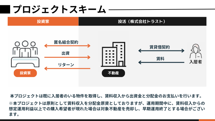 いずれの物件も賃貸借契約締結済みの入居中物件であり、賃料収入を原資とするインカムゲイン型のプロジェクトとして、安定性を重視したポートフォリオ構成となっています。