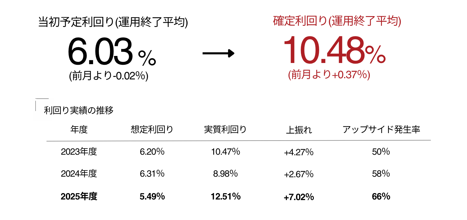 想定利回りに対する上振れとアップサイド発生率はいずれも安定して推移しており、特に2025年度は大きく上振れする結果となりました。運用の再現性と精度が着実に高まっていることが、実績として表れています。